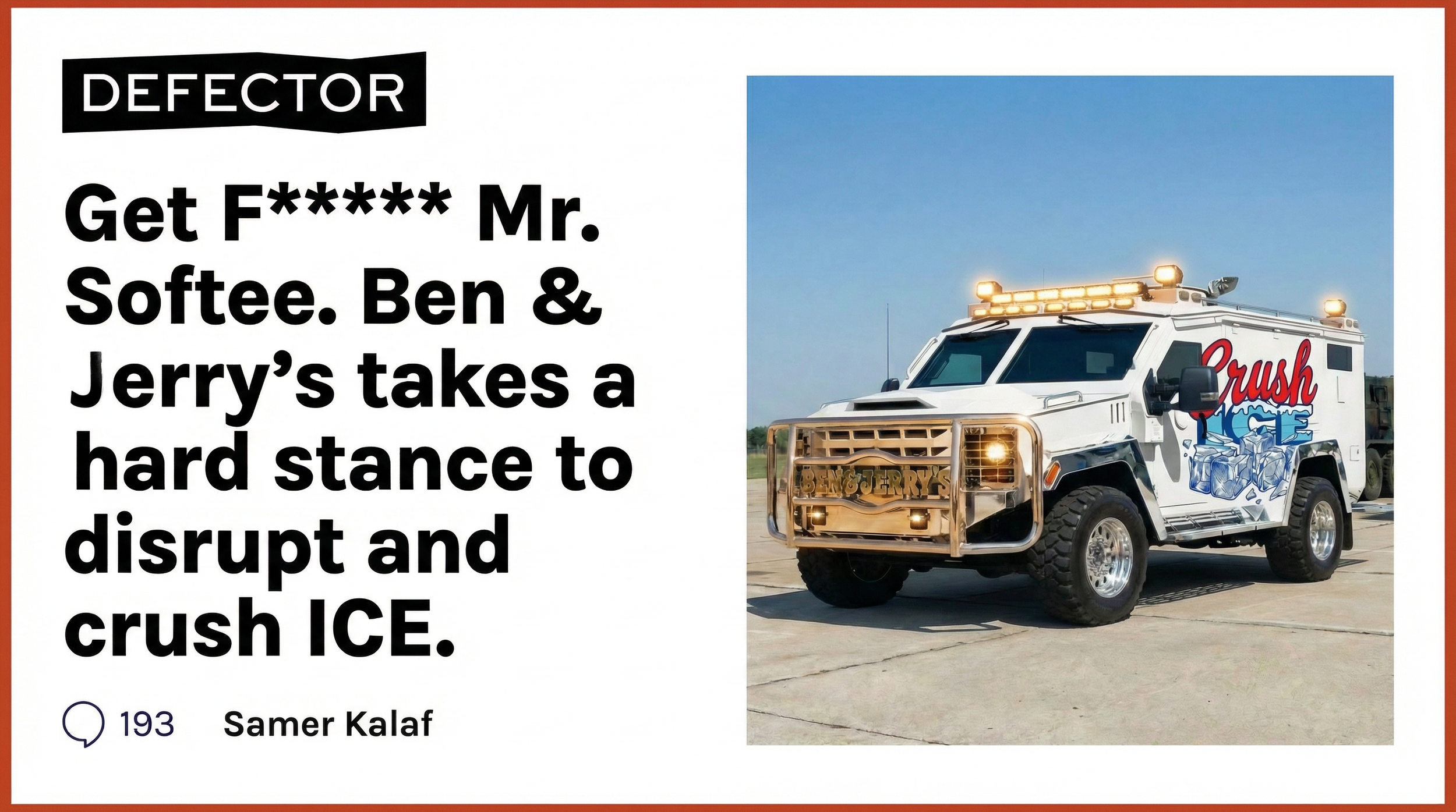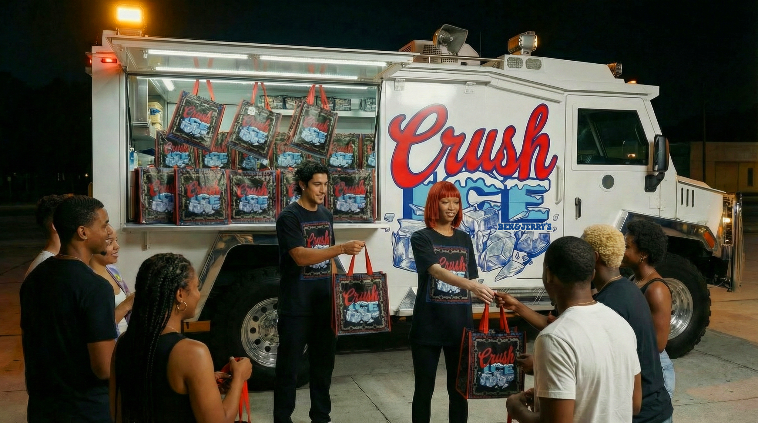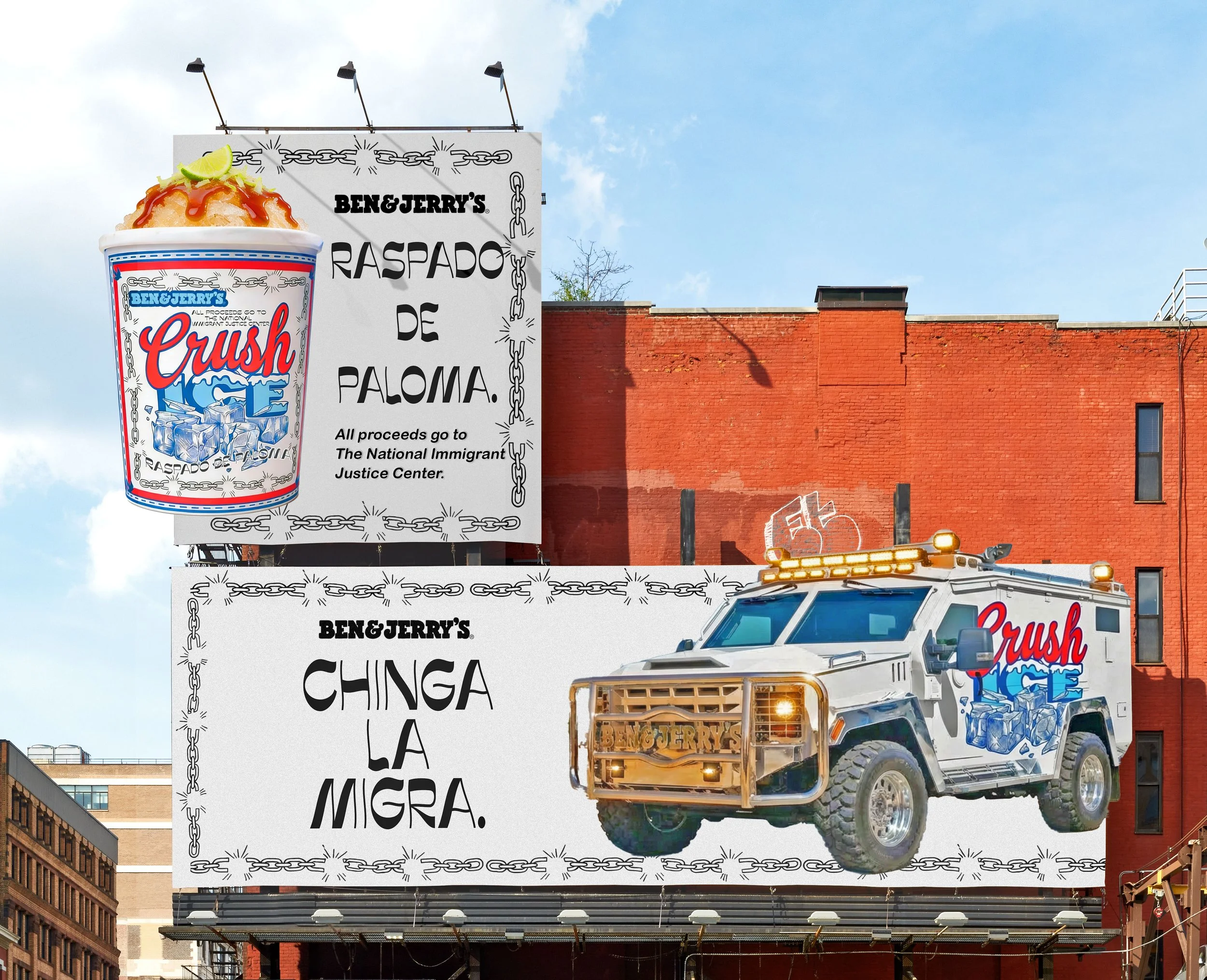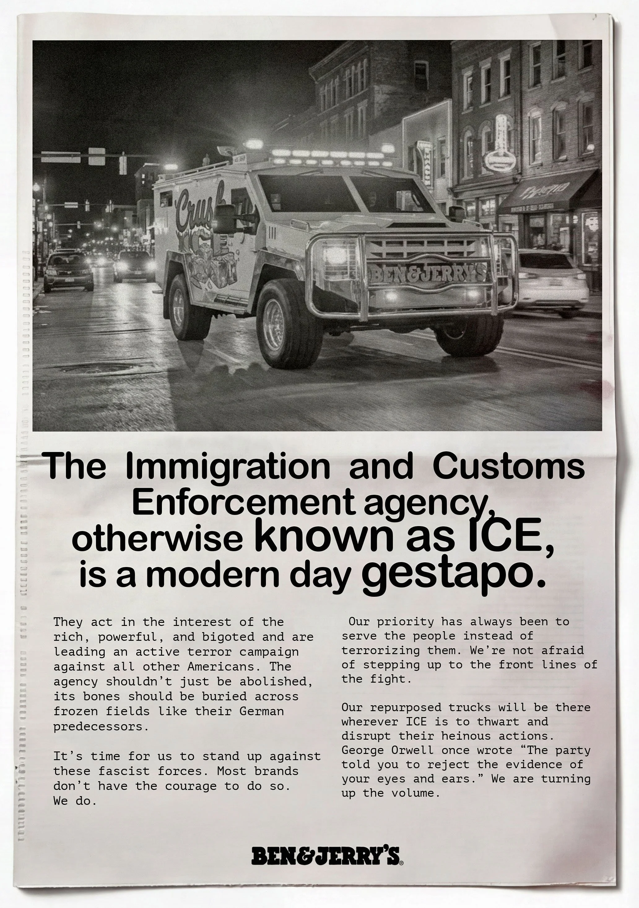 We’re repurposing SWAT trucks into Ice Cream trucks and sending them to protect all our neighbors from ICE. These Crush Ice trucks will blare “Bad Boys” to alert people that ICE is around and our trucks are tough enough to act as a defense at anti-ICE protests.