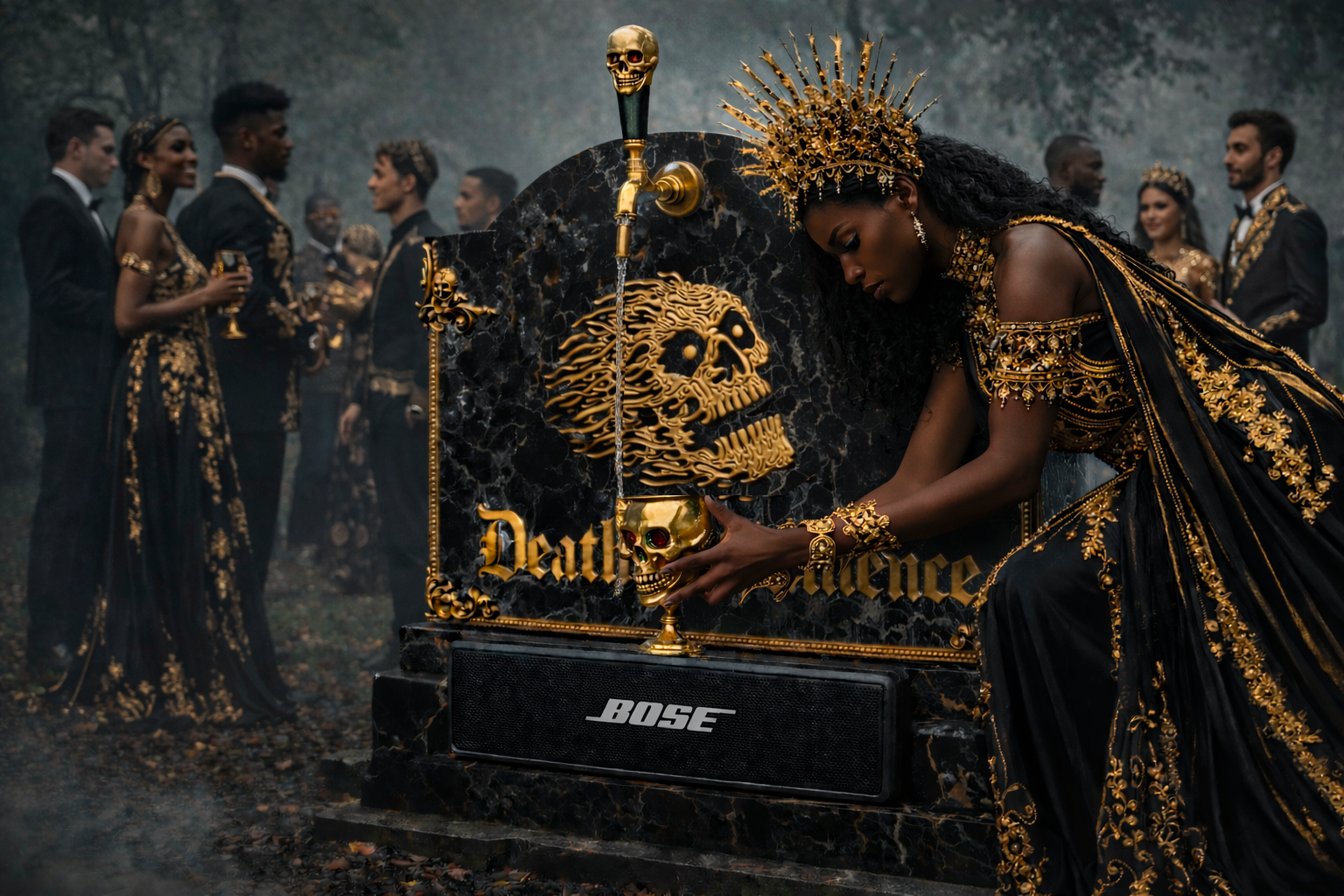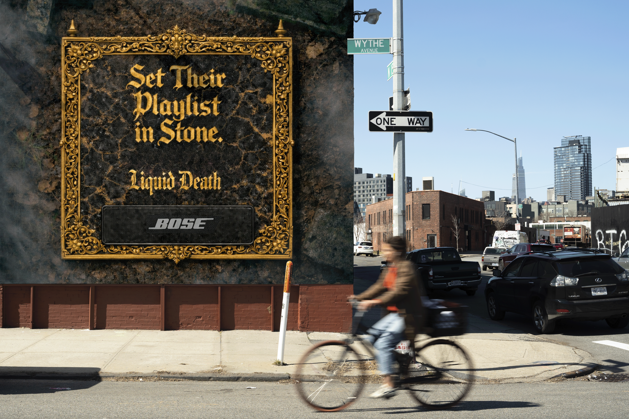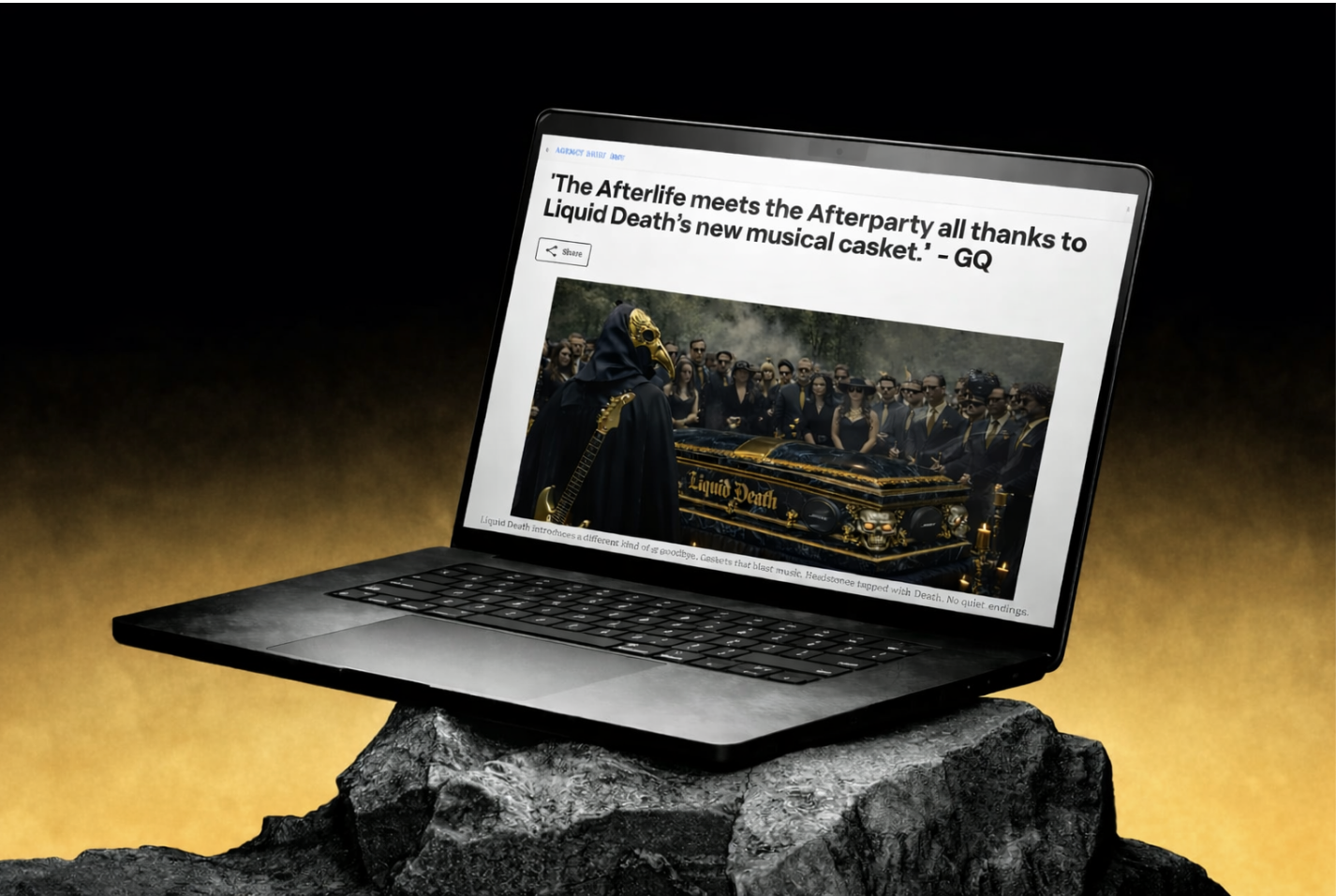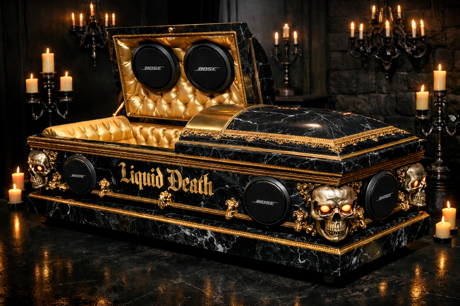 Liquid Death has vowed to party until the very end…but then what? We’ve teamed up with Spotify and Bose to present the first-ever line of caskets with a built-in speaker. As you shuffle off the mortal coil, your favorite tracks begin the eternal shuffle six feet under. Above ground, your funeral becomes a last waltz as we pump up the playlist volume and pour out some Liquid Death.